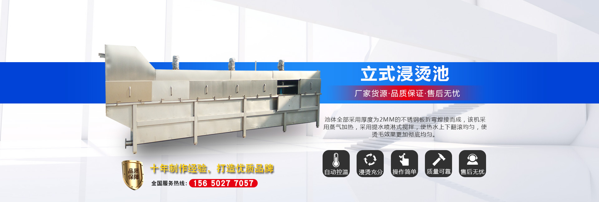 公司長期與國內(nèi)外屠宰加工企業(yè)合作,走引進(jìn)——消化——?jiǎng)?chuàng)新和自主研發(fā)相結(jié)合的道路,在國內(nèi)外同類產(chǎn)品的基礎(chǔ)上,不斷更新和改造。公司主要設(shè)備有:A字型立式脫毛機(jī)、臥式脫毛機(jī)、強(qiáng)力噴淋機(jī)、松毛機(jī)、浸燙池、螺旋預(yù)冷機(jī)、禽籠清洗機(jī)、電暈機(jī)、兔扯皮機(jī)、兔割前爪/后爪機(jī)、剝胗機(jī)、自動(dòng)洗鉤機(jī)、螺旋燙爪機(jī)、雞爪脫皮機(jī)、分割輸送帶等屠宰用設(shè)備。其中,公司獨(dú)力發(fā)明生產(chǎn)設(shè)計(jì)的“電動(dòng)調(diào)節(jié)脫毛機(jī)”及“自動(dòng)控水控溫浸燙池”順利通過知識(shí)產(chǎn)權(quán)局的實(shí)質(zhì)性審查。公司所生產(chǎn)的設(shè)備 可與國外同類產(chǎn)品配套使用,設(shè)備遠(yuǎn)銷阿爾及利亞、澳大利亞等中東、非州等并建立了長期穩(wěn)定的合作關(guān)系。